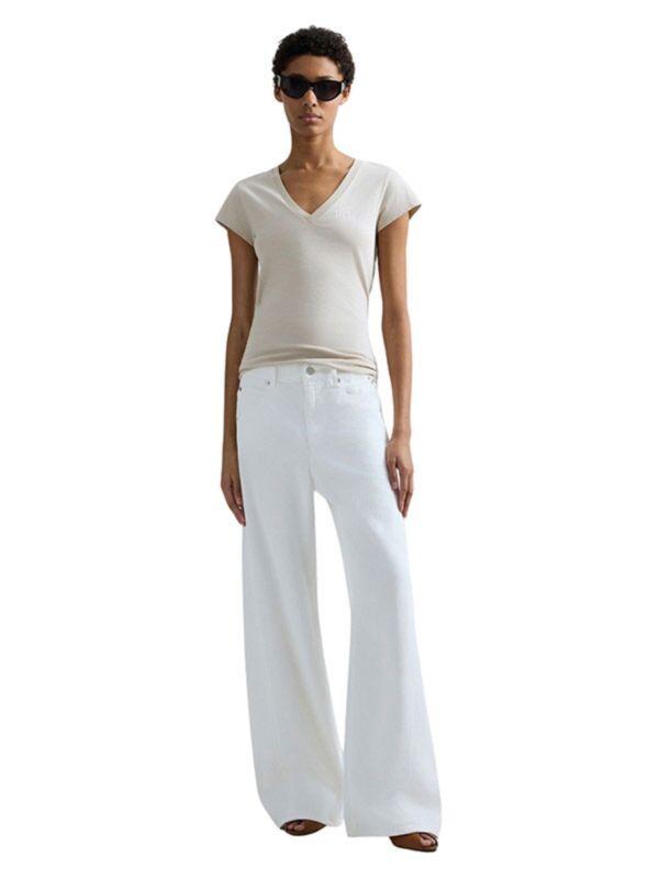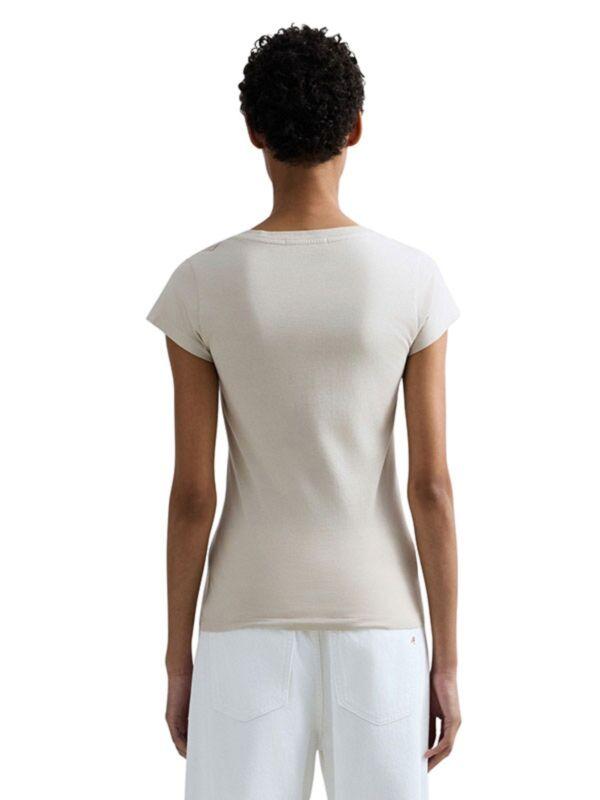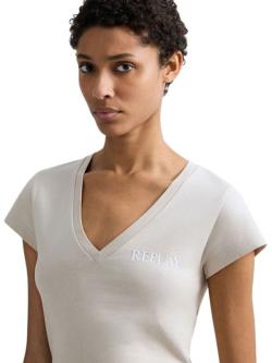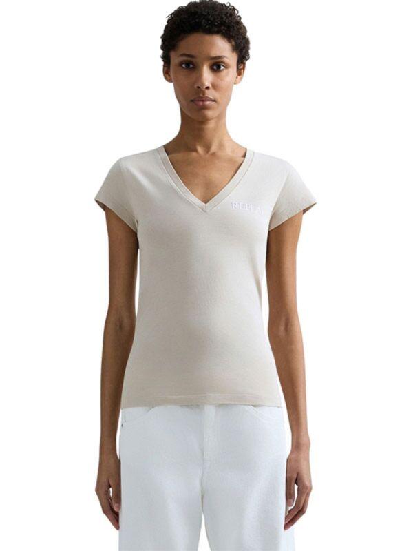 Replay ženska majica slim fit kroja. Kratki rukavi i V izrez. Diskretni logo print na grudima. Bež boja. Pamuk.