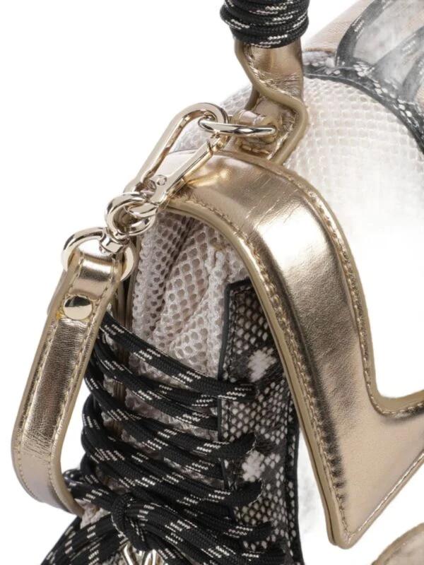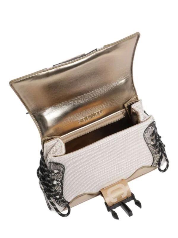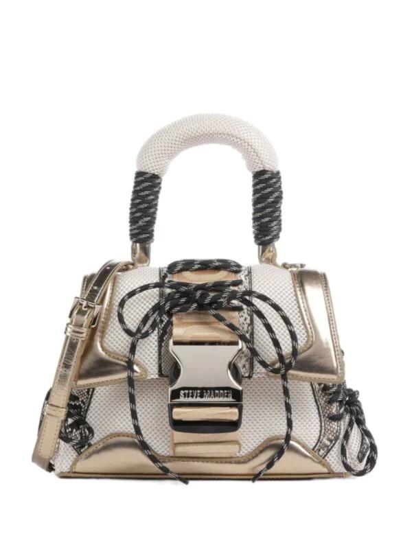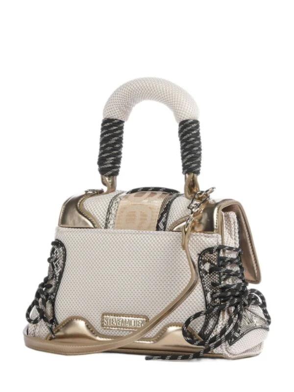Steve Madden ženska torba sa dekorativnim kaišem. Metalna pločica sa logom brenda. Podesiv kaiš. Poliester. Bela i zlatna boja.