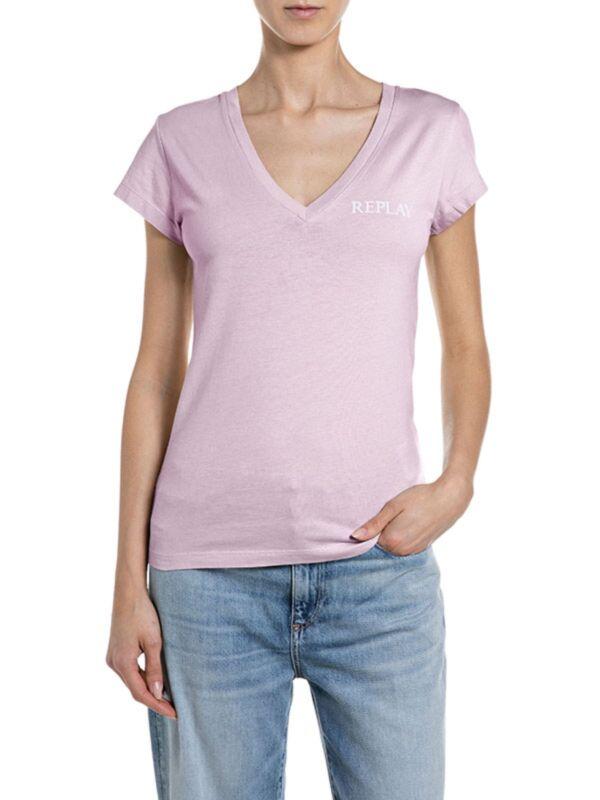 Replay ženska majica kratkih rukava sa V izrezom. Svetloroze boja. Beli logo print napred. Pamuk.